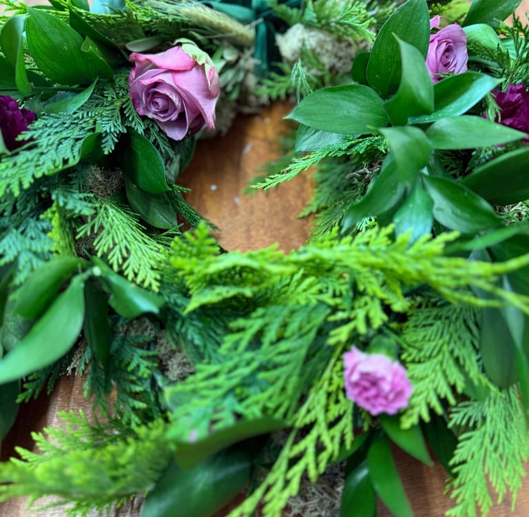 The longevity of your wreath begins with how it’s made. At Blooms & Evergreen, we use moss-based rings, which act as natural sponges, holding moisture for weeks. Foam-free designs not only reduce plastic waste but also help keep foliage hydrated.