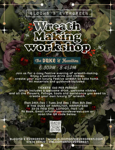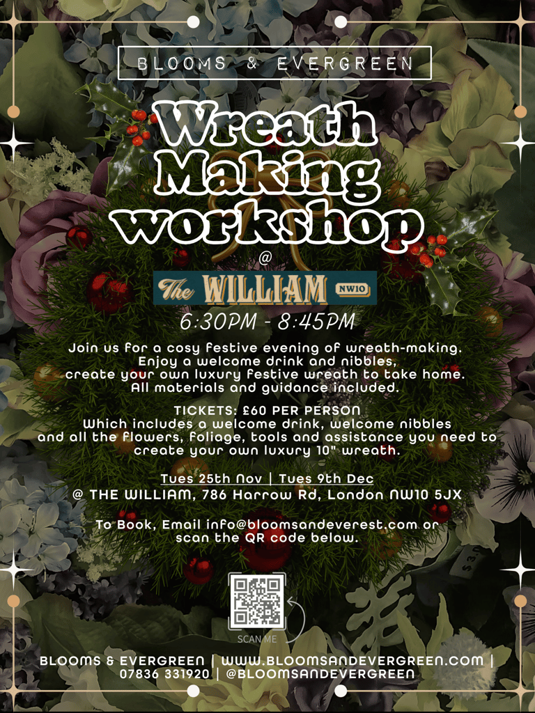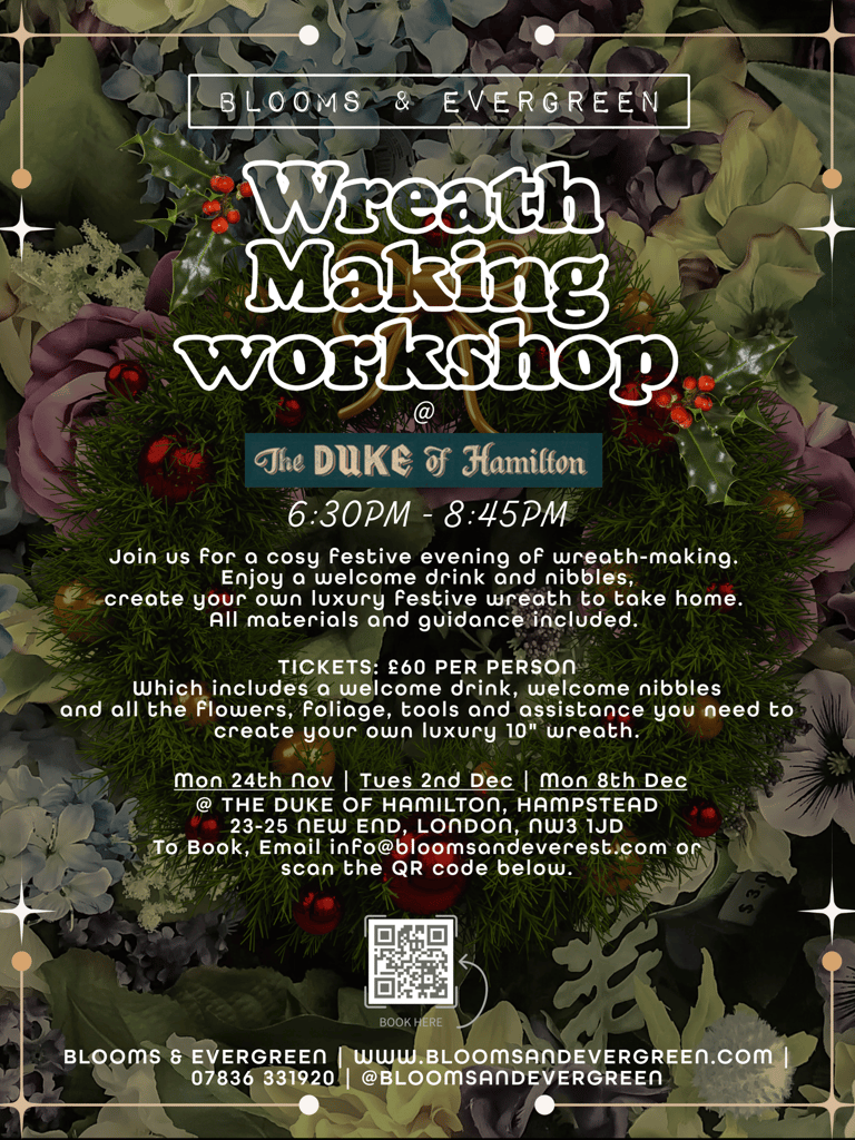 Join us for a festive evening of creativity at our Blooms & Evergreen public workshops. Held in beautiful London venues, these classes are designed for larger groups, making them the perfect way to celebrate the season with friends, colleagues, or simply meet new people.